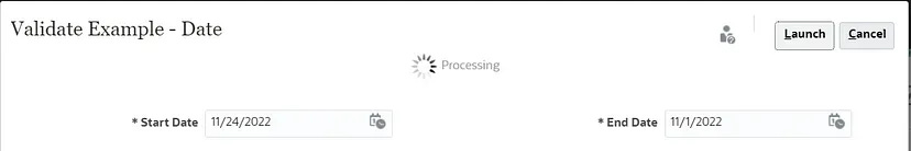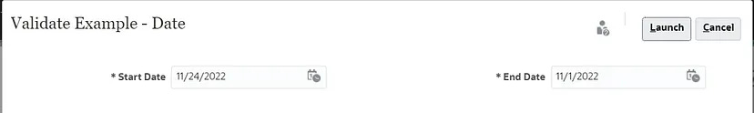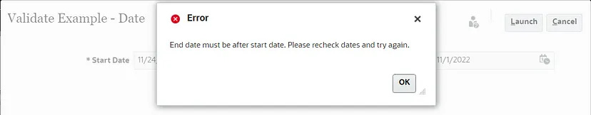 validateRtp(rtps.rtpEndDate, {it.Date.compareTo(rtps.rtpStartDate.Date) >= 0}, mbl, "DATE.EndDateBeforeStartDate")Let’s see what it looks like in action